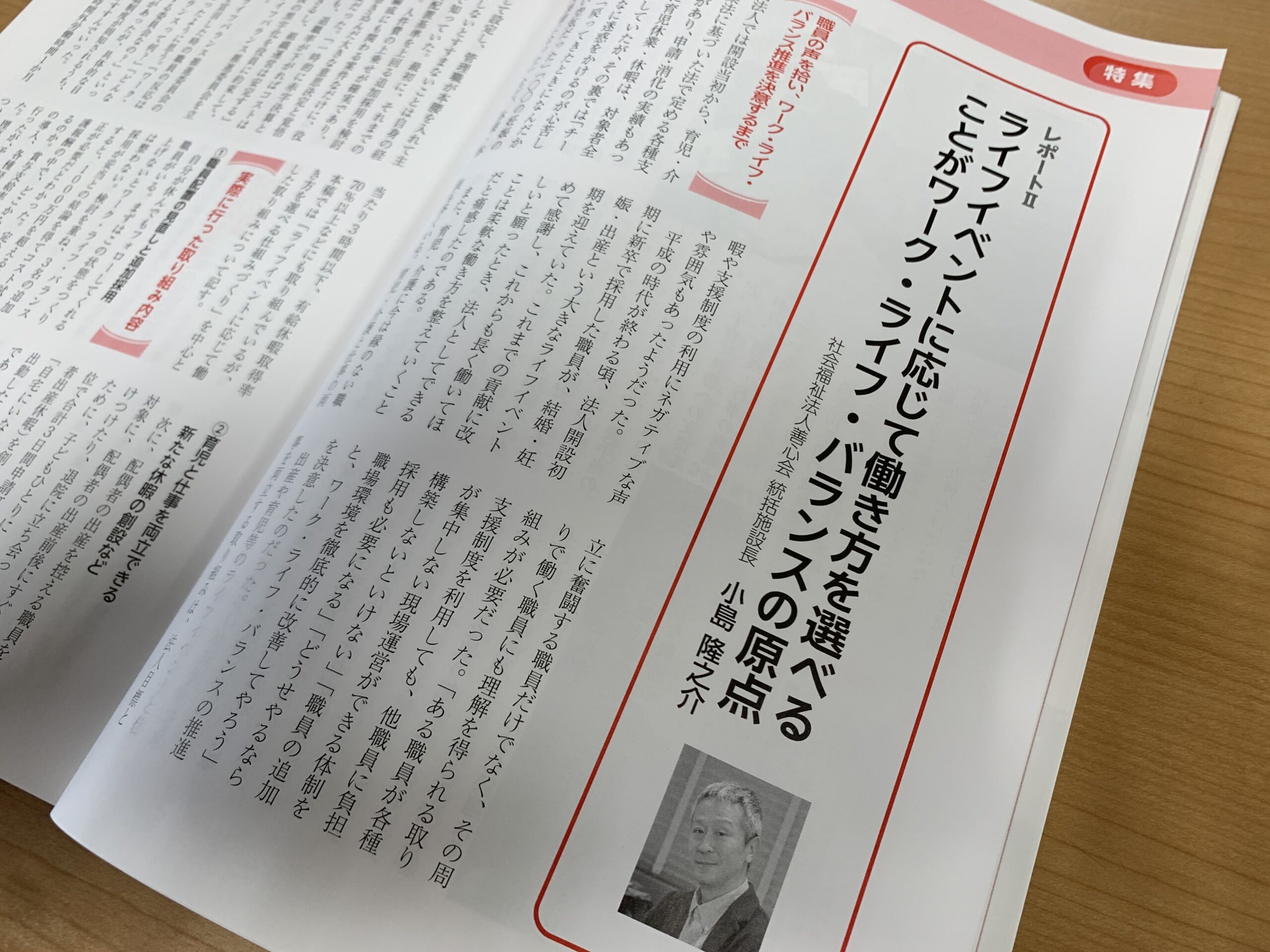 全国社会福祉協議会が出版している「月間福祉2月号」に、当法人の統括施設長 小島隆之介 の執筆したレポートが掲載されました。テーマは「ライフイベントに応じて働き方を選べることがワーク・ライフ・バランスの原点」。ワーク・ライフ・バランス推進を決意するまでの経緯や実際の取り組み内容とその成果、各種認定取得とその影響力について記しています。